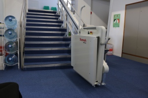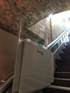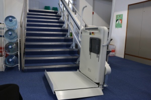 Elle est entièrement automatisée et robuste, l’EPMR (Élévateur pour Personnes à Mobilité Réduite) équipe aussi bien un hall intérieur qu’un escalier d’accès extérieur.